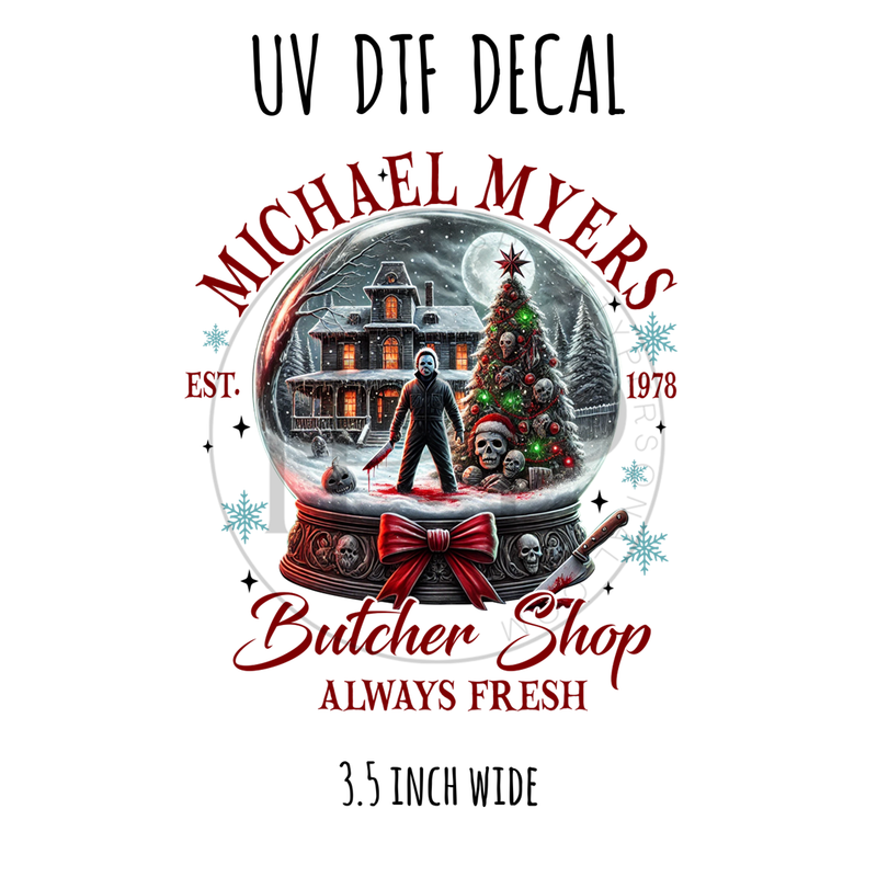 #648 Horror Christmas Snow globe Butcher Shop - 3.5 inch wide UV DTF decal